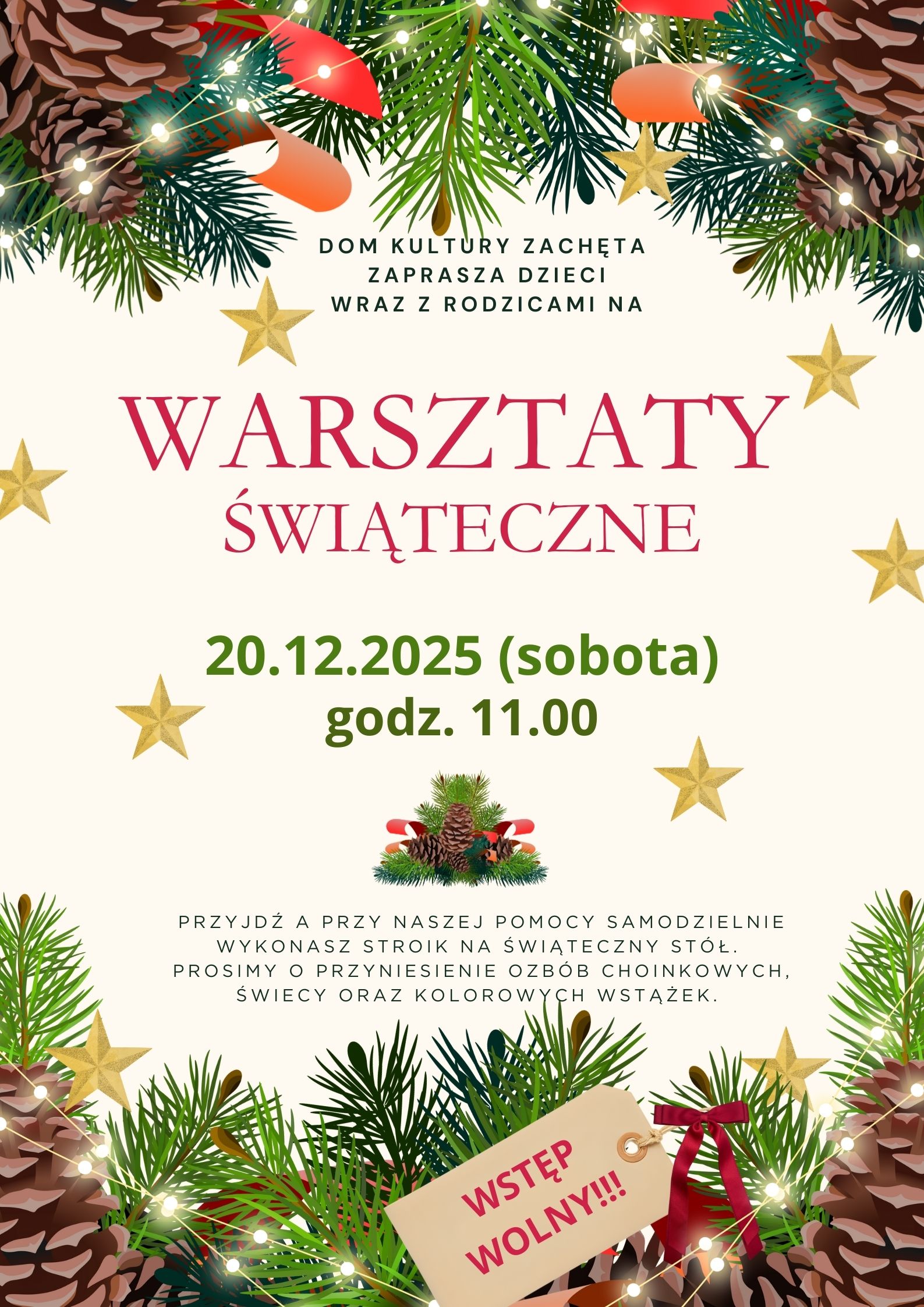Dom Kultury Zachęta zaprasza dzieci wraz z rodzicami na Warsztaty Świąteczne 20 grudnia 2025 roku o godzinie 11:00 Czytaj więcej…