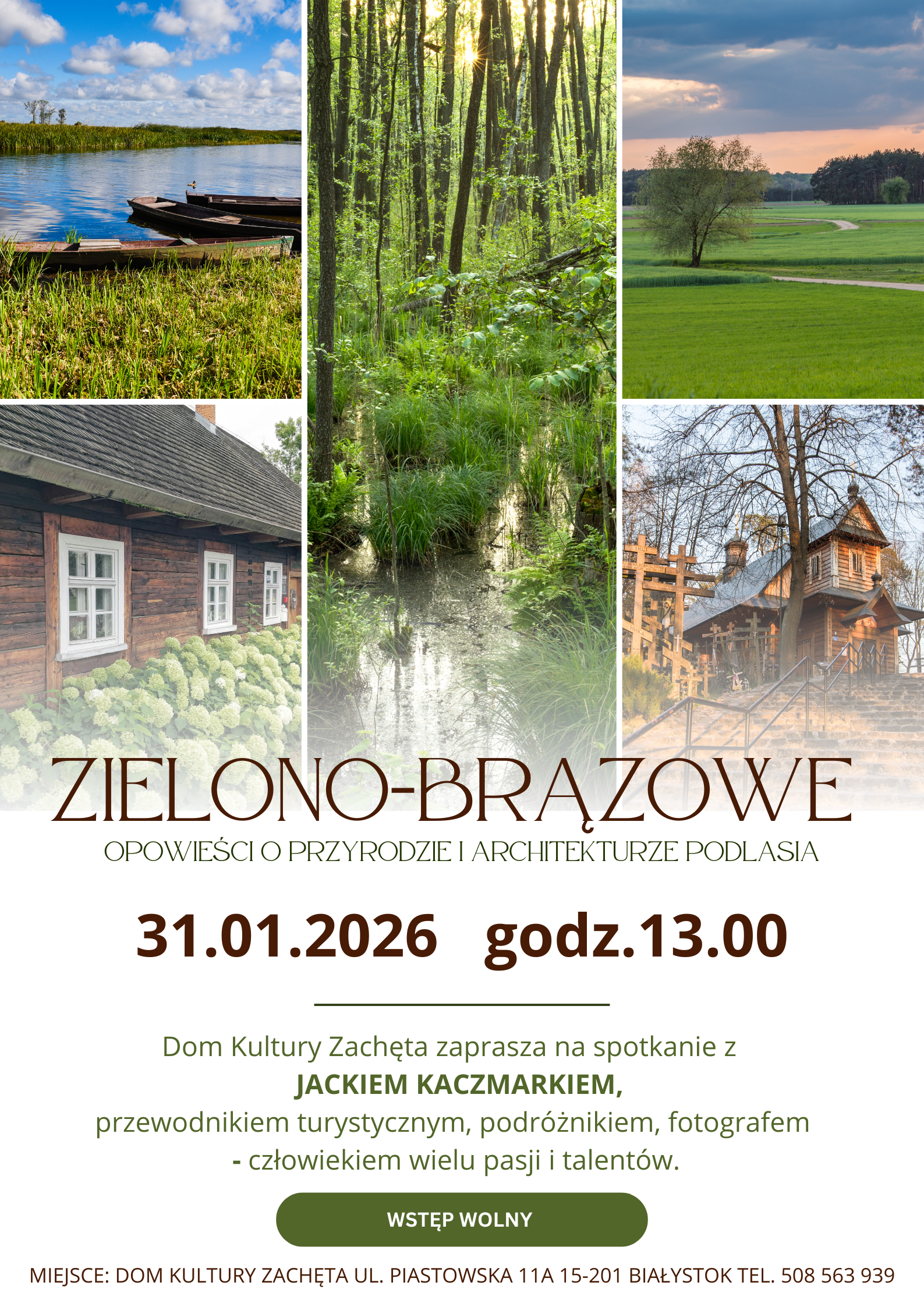Zielono-Brązowe opowieści o przyrodzie i architekturze Podlasia. Dom Kultury zaprasza 31 stycznia 2026 roku o godzinie 13:00 na spotkanie z Jackiem Kaczmarkiem przewodnikiem turystycznym, podróżnikiem, fotografem. Czytaj więcej…