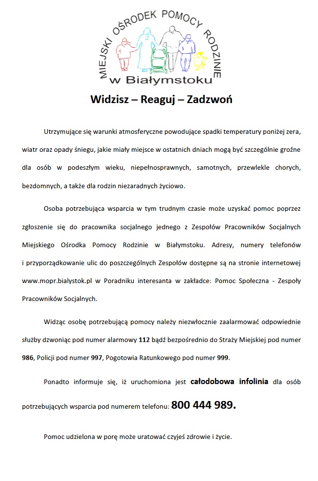 Utrzymujące się warunki atmosferyczne powodujące spadki temperatury poniżej zera, wiatr oraz opady śniegu, jakie miały miejsce w ostatnich dniach mogą być szczególnie groźne dla osób w podeszłym wieku, niepełnosprawnych, samotnych, przewlekle chorych,bezdomnych, a także dla rodzin niezaradnych życiowo.